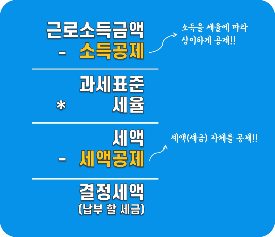 ⁕공제 : 받을 몫에서 일정 수량이나 금액을 뺌. (세금에서 일정 금액을 빼주는 것을 의미한다고 보시면 됩니다.)