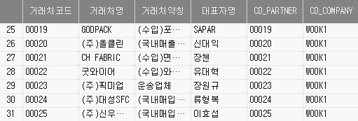 SELECT CD_PARTNER AS 거래처코드, LN_PARTNER AS 거래처명, SN_PARTNER AS 거래처약칭, NM_CEO AS 대표자명, *